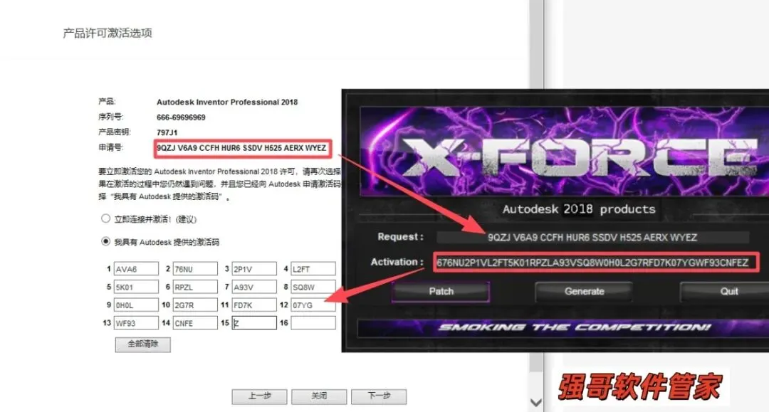 18.把申请号复制到注册机里面的Request中,先点击Patch,再点击Generate后复制Activeation中生成的激活码,然后粘贴激活码至我具有Autodesk提供的激活码方框中。最后点击下一步即可。