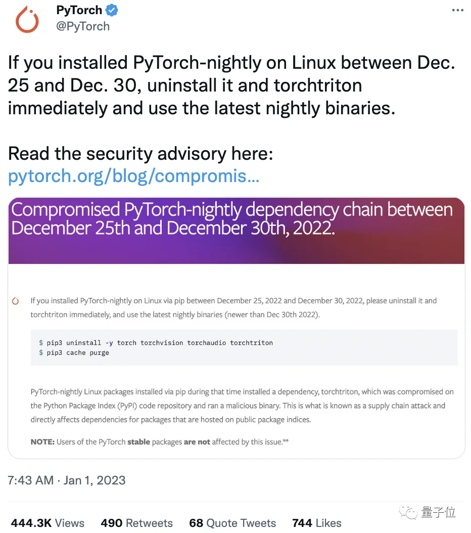 “所有在2022年12月25日至12月30日期间,在Linux系统安装了PyTorch-nightly(每日更新版)的用户,请立即卸载!”