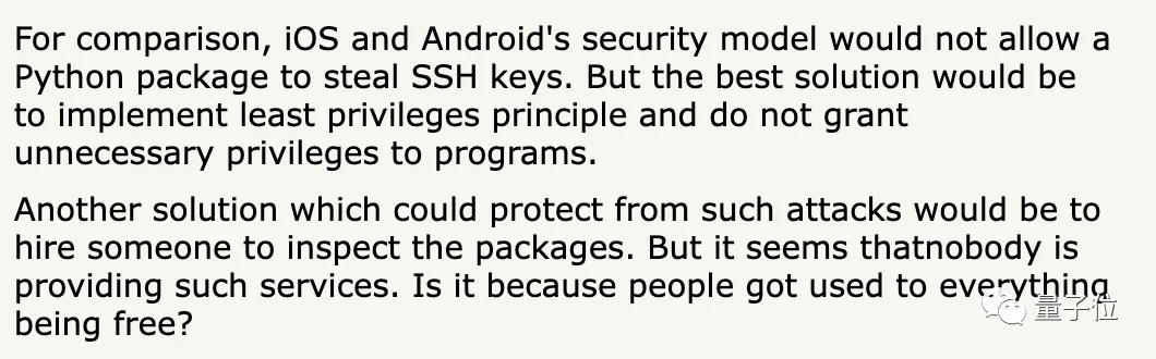 关于SSH密钥,Linux存在一些漏洞,而iOS和Android的安全模型就不会允许Python软件包窃取SSH密钥。