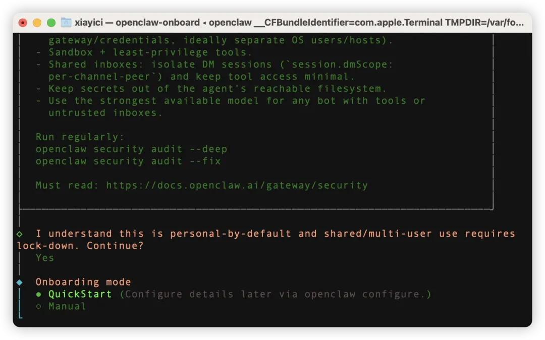 TypeScript 第一步选择Yes I understand this is personal-by-default and shared/multi-user use requires lock-down. Continue? ● Yes / ○ No 第二步新手选择QuickStart Onboarding mode ● QuickStart (Configure details later via openclaw configure.) ○ Manual |