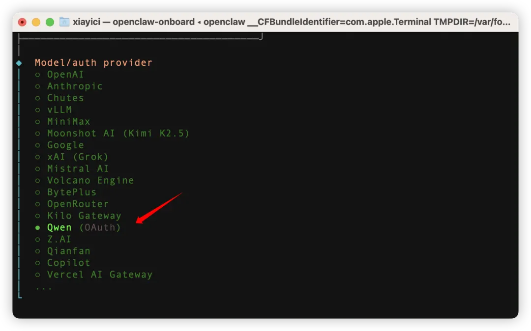 在选择模型这里,保持默认,qwen-portal/coder-model