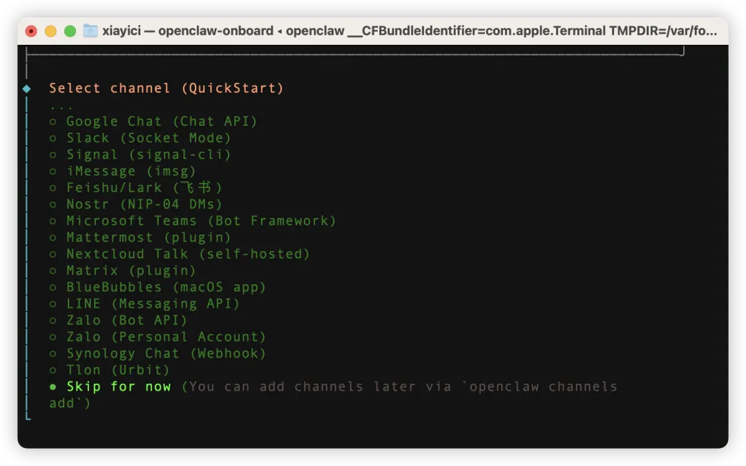 TypeScript Configure skills now? (recommended) │Yes │ ◇Install missing skill dependencies │Skip for now │ ◇Set GOOGLE_PLACES_API_KEY for goplaces? │No │ ◇Set GEMINI_API_KEY for nano-banana-pro? │No │ ◇Set NOTION_API_KEY for notion? │No │ ◇Set OPENAI_API_KEY for openai-image-gen? │No │ ◇Set OPENAI_API_KEY for openai-whisper-api? │No │ ◇Set ELEVENLABS_API_KEY for sag? │No ◆Enable hooks? │◼ Skip for now │◻ 🚀 boot-md │◻ 📎 bootstrap-extra-files │◻ 📝 command-logger │◻ 💾 session-memory |