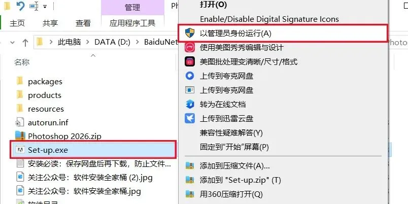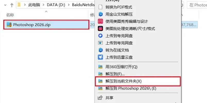 1、下载Photoshop 2026软件安装包到电脑上,右键选择【解压到当前文件夹】。