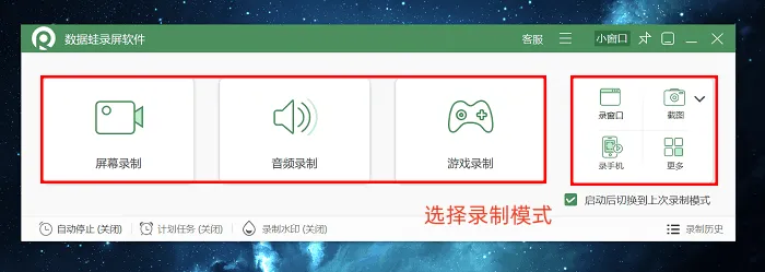步骤1:先打开数据蛙录屏软件,主界面里陈列着多种录制模式,今天我们专门讲讲窗口录制。这种模式的优势在于精准性,当你需要录制特定窗口,比如微信聊天框、浏览器页面时,选择它就不会录入桌面其他杂乱内容,使用起来很省心。