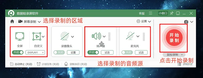 步骤2:确定好录制区域后,大家还可以根据需求设置录制的清晰度、挑选合适的音频源。等这些都设置妥当,点击“开始录制”,就能开启录屏啦。