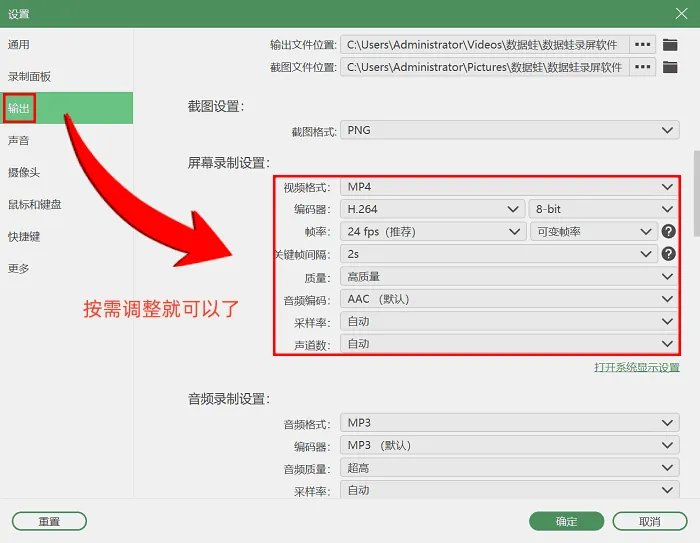 步骤2:选好录制模式后,接下来进行参数调节,具体设置可按需调整。音频方面,要是录制的是网课、电影片段,只需要系统自带的声音,那就只勾选系统声音;要是打算边录边讲解,比如制作教学视频,就把麦克风声音也勾选上,两种声音同时录制也是可行的。至于Windows录屏的设置位置,点击输出设置就能找到并调整。设置完毕后,点击右侧的录制按钮,软件就会开始录制。