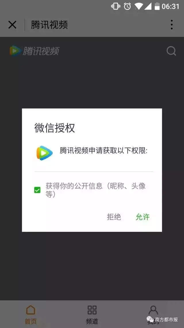 打开“腾讯视频”小程序,如同早前不少公众号开发模式、H5、微网页等,首先要对用户信息、地理位置等授权进行选择。