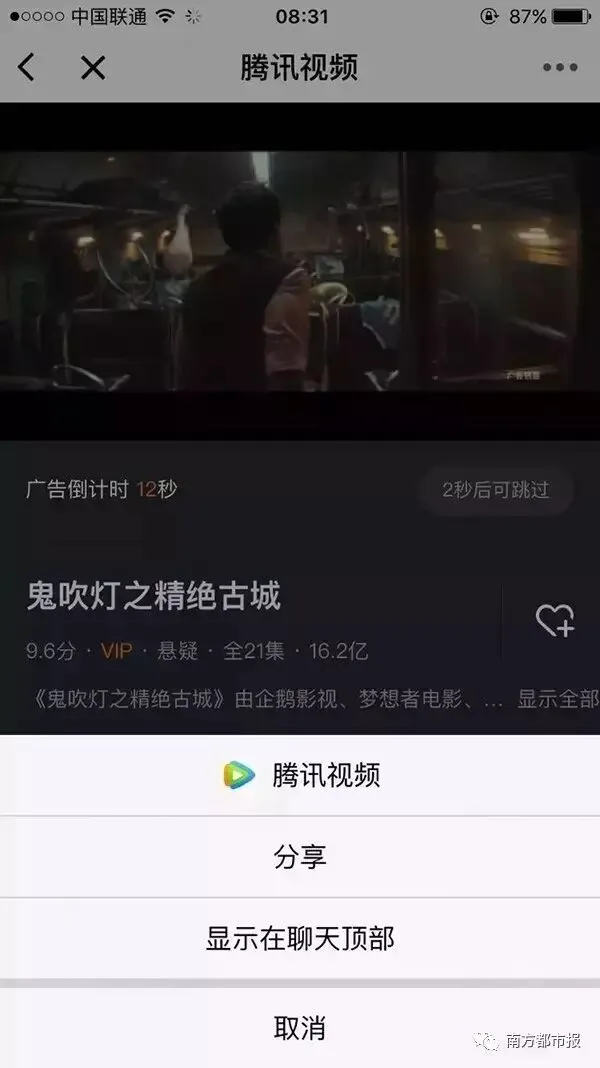 点击右上角弹出菜单,共有“分享”、“显示在聊天顶部”、“添加到桌面”(iOS无此选项)三(两)个按钮。