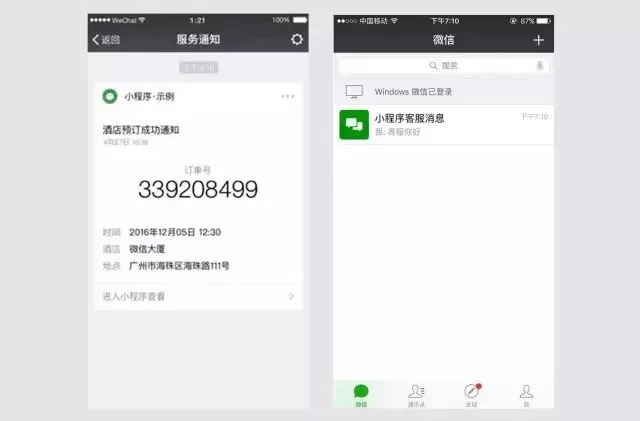 消息通知:商户可以发送模板消息给接受过服务的用户,用户可以在小程序内联系客服,支持文字和图片,解决用户与小程序的沟通问题。