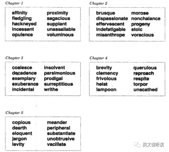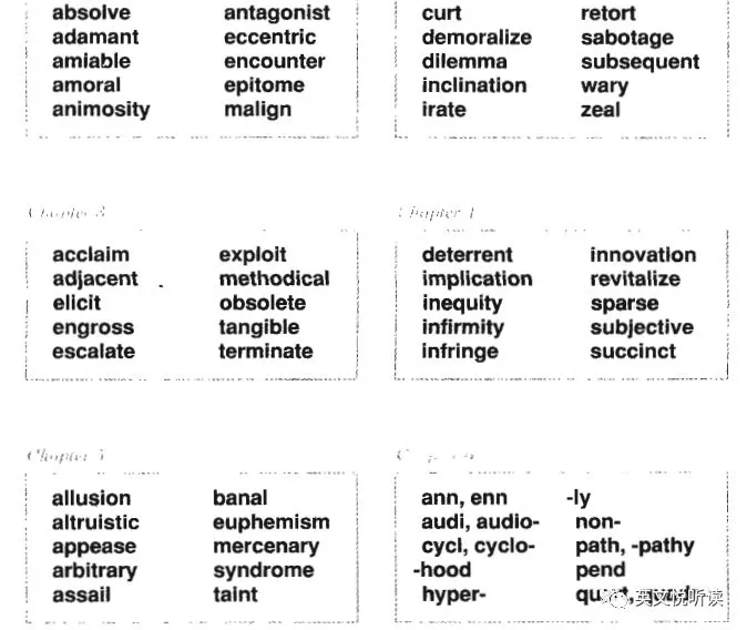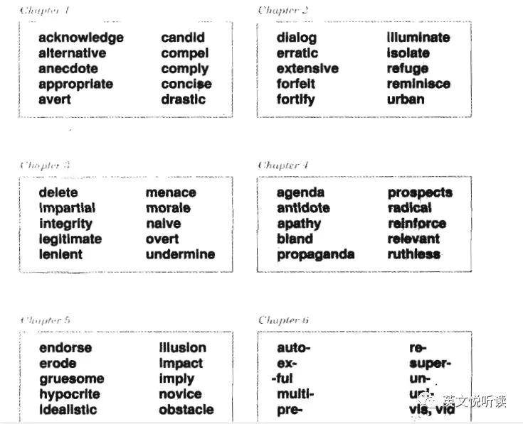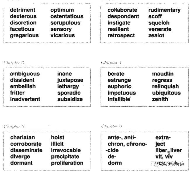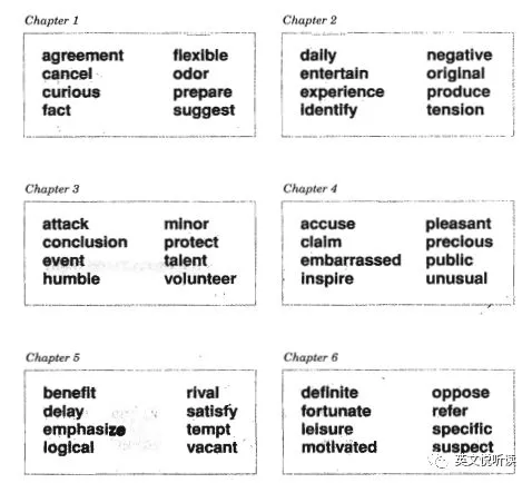 6册书,6个级别,大家一定想知道这六册书讲了多少词汇,会不会像我们看到的那些词汇书一样,一本书讲好几千个。如果作者说,每本书只讲了最多300个词汇,大家会不会很吃惊,那岂不是20,000个词汇里,精选了不到2,000个词汇讲解。没错,就是这个样子的。让我们来看看吧。 以下部分为出版社的说法,作者适当加工整理。英语词汇入门 Vocabulary Basics,30章,每章8个词汇,240个词汇。所涉及词汇与我国高中及大学非英语专业一年级相当。英语词汇基础 Groundwork for a Better Vocabulary,25章,每章10个词汇,250个词汇。所涉及词汇与我国大学非英语专业四级水平相当(4,200词汇水平)。英语词汇提高 Building Vocabulary Skills,30章,其中26章讲词汇,4个章节讲构词成分(前缀、后缀和词根)。无论词汇还是构词成分,都是每章10个,所以本书有260个词汇,40个构词成分。所涉及词汇与我国大学非英语专业六级、英语专业低年级相当(6,500词汇水平)。英语词汇扩展 Improving Vocabulary Skills,30章,其中26章讲词汇,4个章节讲构词成分。词汇和构词成分,都是每章10个,所以本书有260个词汇,40个构词成分。所涉及词汇与我国英语专业一、二年级相当(8,000词汇水平)。英语词汇突破 Advancing Vocabulary Skills,30章,其中26章讲词汇,4个章节讲构词成分。词汇和构词成分,都是每章10个,所以本书有260个词汇,40个构词成分。所涉及词汇与我国适合英语专业高年级水平学习者(12,000词汇水平)。英语词汇飞跃 Advanced Word Power,30章,每章10个词汇,300个词汇。所涉及词汇与我国英语专业高年级及以上相当。粗略统计,6册书讲解了1,570个单词,120个构词成分(前缀,后缀和词根)。所以每册书的词汇,都是该级别的核心词汇。就是这1,570个词汇核心词汇,串起来了英语中大部分词汇。04 似曾相识的那些词汇了解了每册词汇书对应的我国英语教育相应的程度,实际上我更好奇的是,每册书究竟选的是哪些词汇?百闻不如一见,让我们就来见一见吧。虽然每册书选择的词汇不超过300个,如果要是列出来,也是要占很多版面的。所以,给出这套书初版每一册第一个单元的全部词汇,一个单元含五章或六章。
