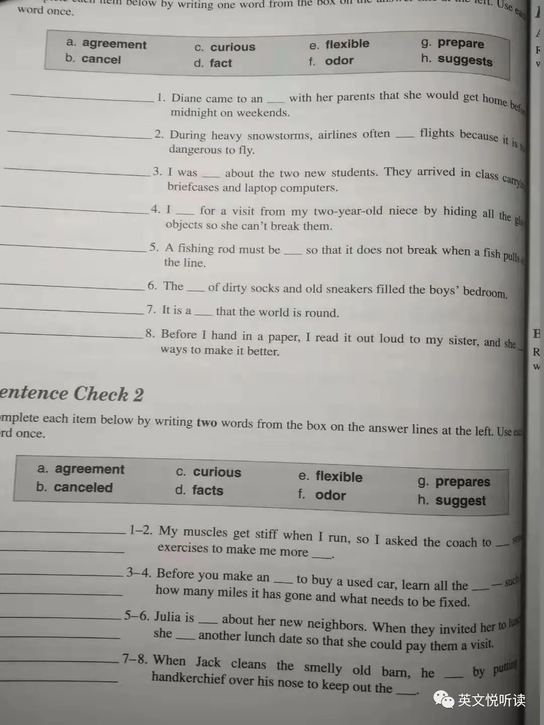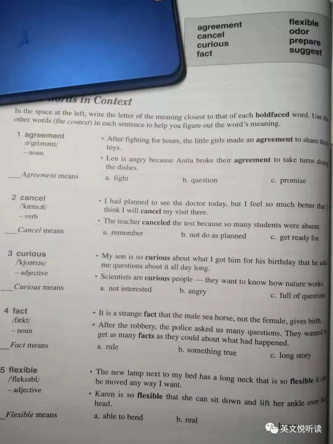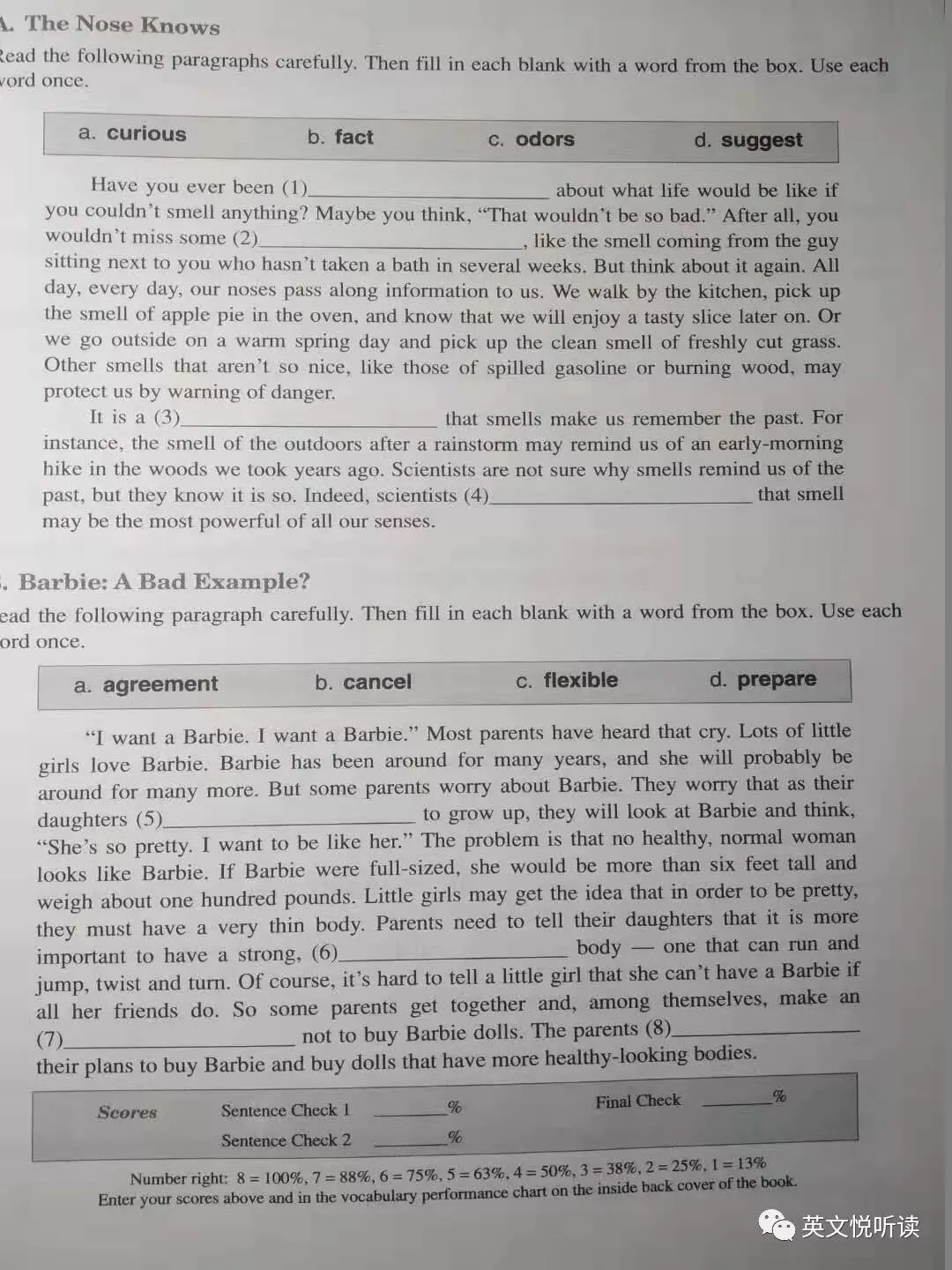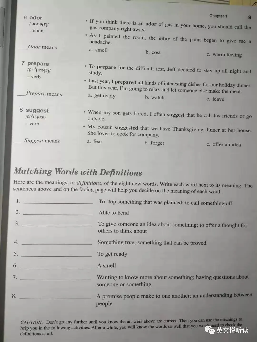 发现自己对前三册词汇比较熟悉,第四册认识的就不多了(有一半),第五、六册里也不是没有不认识的,只是数量实在太少了。特别是后二册,很多词汇都很模糊,感觉有些词汇在阅读中遇到过,可是就是想不起意思,属于一翻原文或者字典就复活了那种词汇,还是不熟啊。作者计划同时开读第一册 入门 和第四册 扩展。 05 不是用来“背”的词汇书相信很多学习英语的小伙伴都死记硬背过生词。是不是本套书也是教我们“背”词汇,如果是这样,我也不会写这篇文章了。因为这样的书俯拾皆是,意义也不是特别大。本丛书的作者提倡的是根据认知原理,通过积极学习(active learning)来熟悉掌握词汇,而非消极的背诵。学习这些核心词汇,我们就可以在阅读、写作中用起来,在各种考试中轻松获取高分。还是先看看书籍的大体结构吧! 每册书有五六个单元,每单元有五六个章节,少的有25个章节,多的是30个章节,每个章节占据四个页面。这里以第1册入门第一章说明,本章包含需要学习8个词汇,然后是五个练习,各章的结构都大体相同。五个练习名称如下:Eight Words in ContextMatching Words with DefinitionsSentence Check 1Sentence Check 2Final CheckEight Words in Context & Matching Words with DefinitionsEight Words in Context,每个词汇给出两个例句,阅读例句,根据上下文推测单词的含义,挑出贴近句子含义单词意思。8个生词,给出16个例句,每个生词出现2次。然后就是Matching Words with Definitions,根据Eight Words in Context 练习中,对每个单词的理解,进行单词与词汇配对,加深对单词的理解。词义解释简明扼要,可能比词典的英文解释还要简略。这个两个练习占了2个页面。