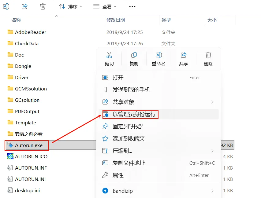 3.选中“Autorun.exe”右键以管理员身份运行
