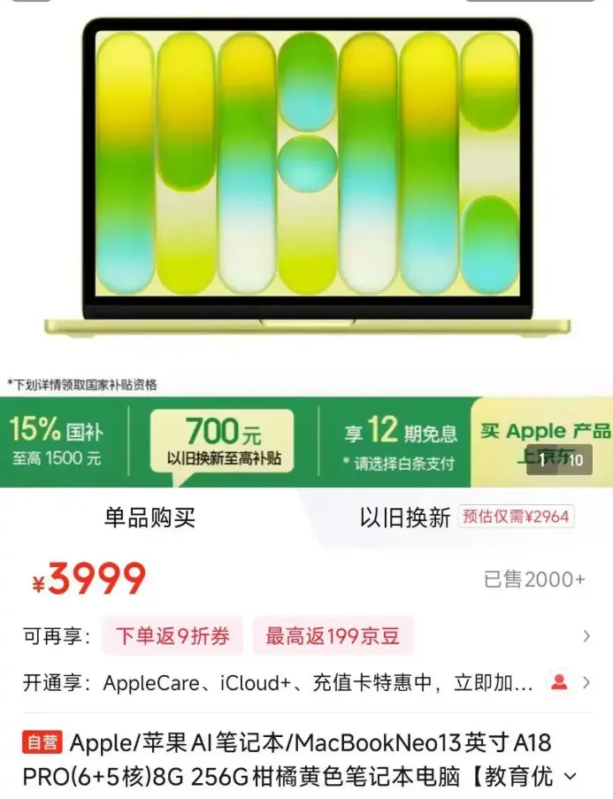 更值得注意的是,在 3 月 6 日正式发售之前,部分电商平台通过叠加教育补贴等优惠,将价格进一步压低到 3999 元左右,这也让苹果笔记本产品首次进入“3000 元档”。