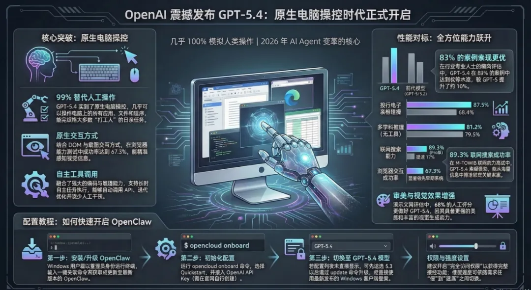 昨晚凌晨两点,OpenAI 毫无征兆地发布了 GPT-5.4。这不再仅仅是一个对话框里的智能助手,而是一个拥有“原生操控电脑能力”的操作系统级 Agent。它标志着 AI 正式从“只会动嘴”的顾问,进化为能够 99% 替代人类重复劳动的“数字员工”。2026 年 AI Agent 的竞争格局,在这一刻被彻底洗牌。