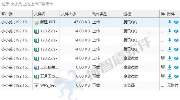 谁、什么时间、通过什么软件(微信、QQ还是邮件)、发走了什么文件、拷贝到了哪个U盘,事无巨细,全部记账。