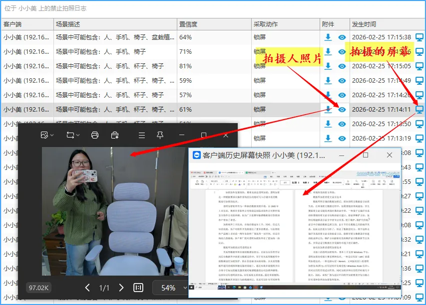 域智盾直接跟摄像头联动。安装一个插件,开启监控。当系统通过摄像头捕捉到有人在对着屏幕“咔嚓”时,直接触发神技:自动锁屏!