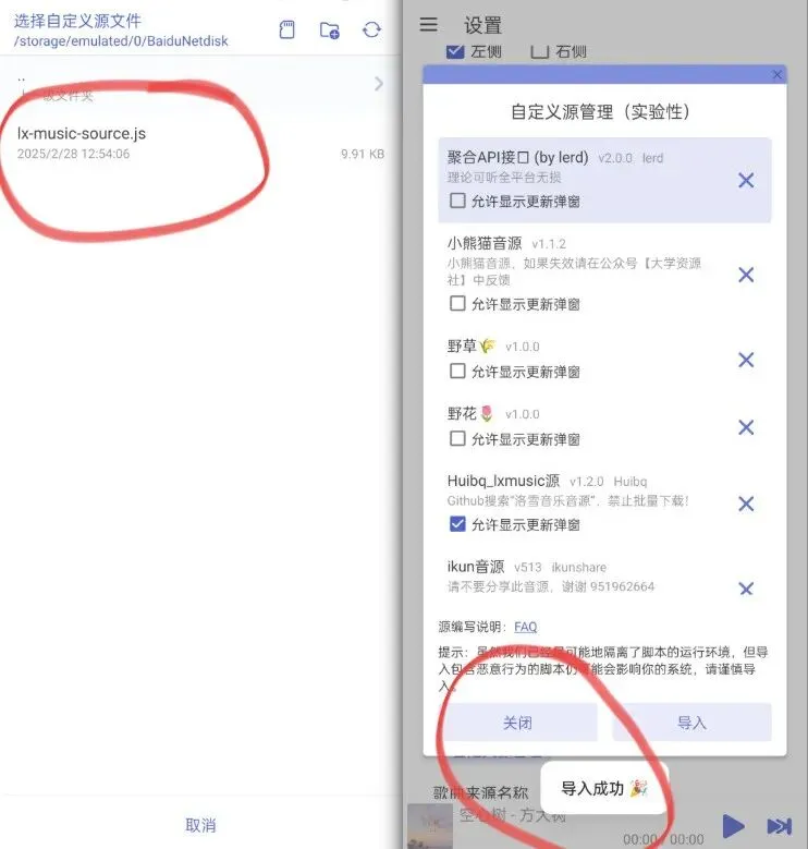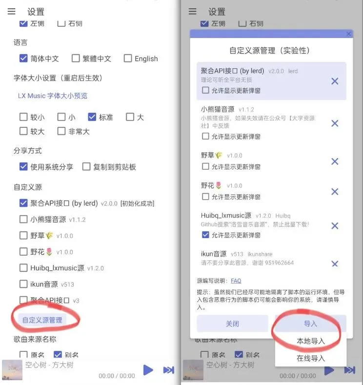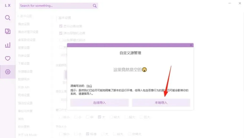 下载软件和音源文件压缩包后,安装软件,并将音源压缩包解压缩,获取.js后缀名的音源文件,进入软件设置-基本设置-自定义源-自定义源管理-导入-本地导入-选择上一步下载的本地音源接口文件-关闭小窗口。