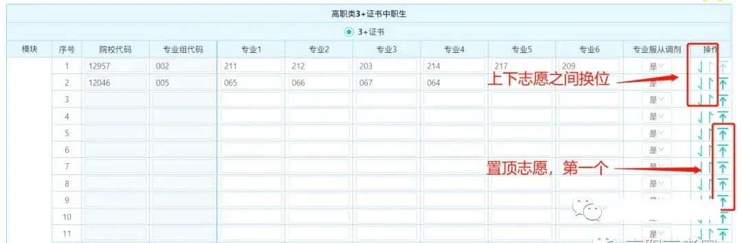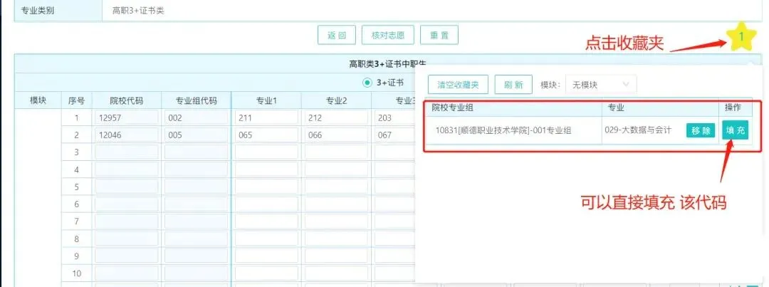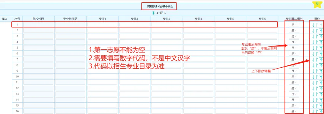 专科组输入院校代码、专业组代码和专业代码填报,一共可以填35个院校专业组,可以不填满。