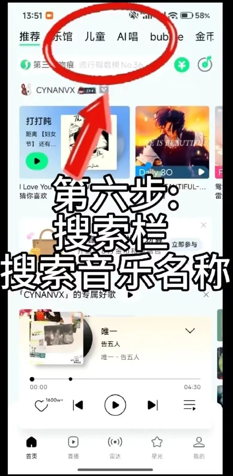 搜索栏搜索想要听的音乐名称
