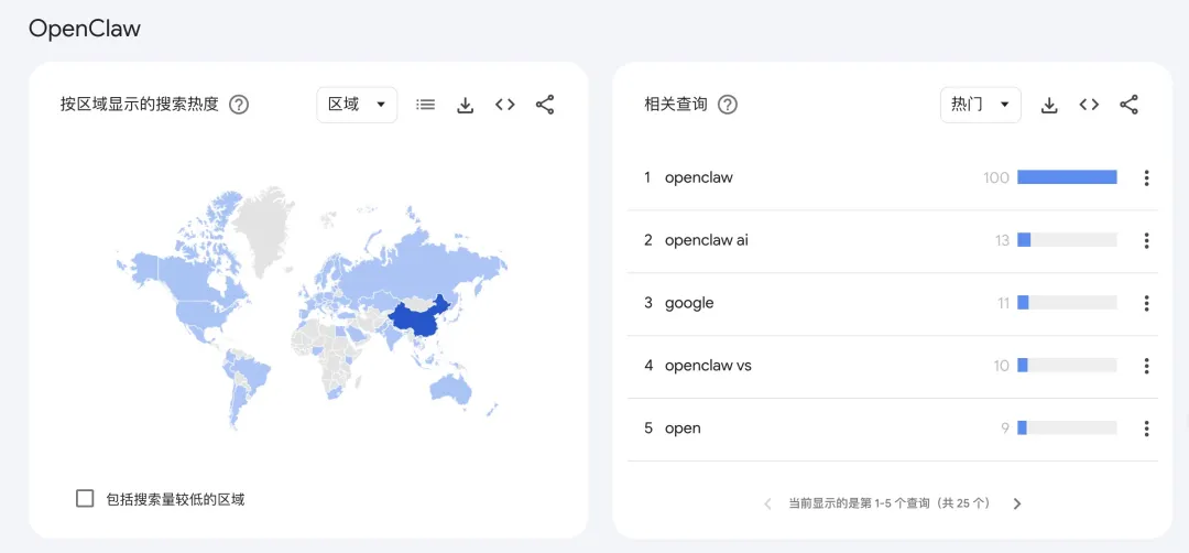 中国用户在 OpenClaw 的搜索热度上一骑绝尘