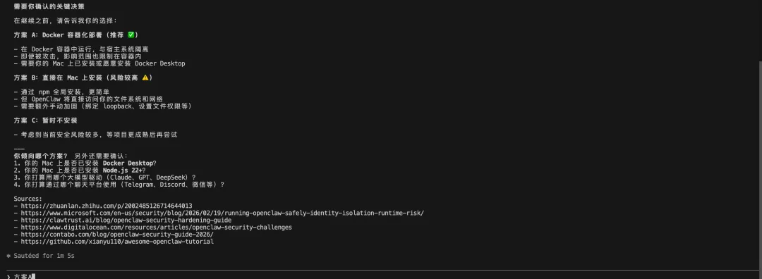 OK,现在帮我安装部署OpenClaw,顺便注意下安全风险,有些需要我确认的地方,需要及时跟我确认,另外一定要确保不给我的电脑带来安全风险 这个Claude Code直接给我们规划了三个方案,我们直接选择风险最小的方案A,容器化部署即可