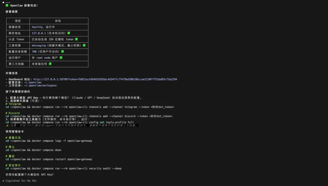 到这里OpenClaw就部署成功了,我们只需要给他一个大模型的key就可以了。这里我们以通义千问为例,直接告诉他千问的API key,让他给我们配置好