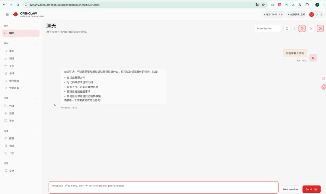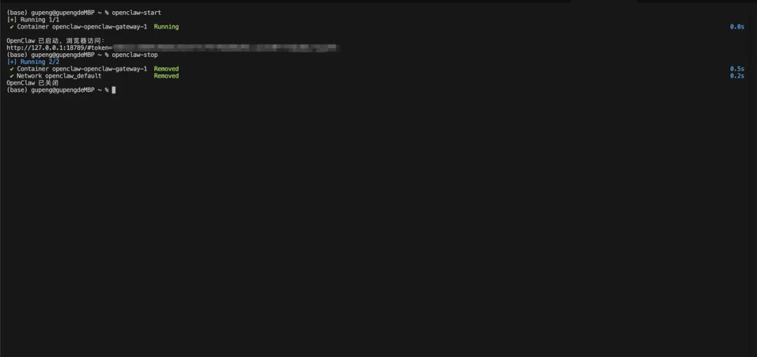 验证下,功能是否正常,ok,正常聊天没有问题。因为我们是容器启动,这里我们再让Claude Code帮我们写个启动脚本,方便下次一键启动和关闭。后续我们只需要在终端执行openclaw-start和openclaw-stop就能启动和关闭了