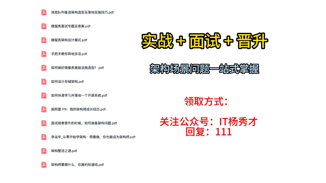 顺便说一下,秀才搭了个学习网站:https://golangstar.cn,整理了大量的面试场景题,欢迎大家上我的网站学习,网站学习更高效哦!秀才也为大家精选了一些架构学习资料,学完后从实战,到面试再到晋升,都能很好的应付。关注秀才公众号:IT杨秀才,回复:111,即可免费领取哦