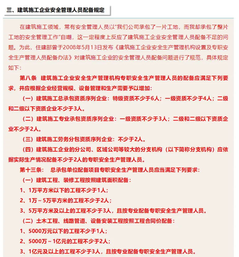 2010年10月11日,原国家安监总局发布了《国家安全监管总局关于冶金有色建材机械轻工纺织烟草商贸等行业企业 贯彻落实国务院<通知>的指导意见》,该指导意见对冶金有色建材机械轻工纺织烟草商贸等行业企业安全管理人员配备作出了规定,具体内容如下: