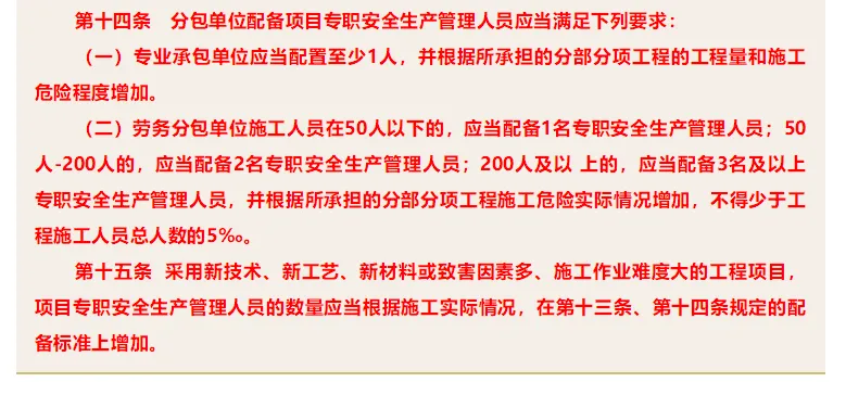第九十二条 第四款 (四)具有两级机构的承包方应设有专职安全管理机构;施工队伍超过30人的应配有专职安全员,30人以下的应设有兼职安全员。