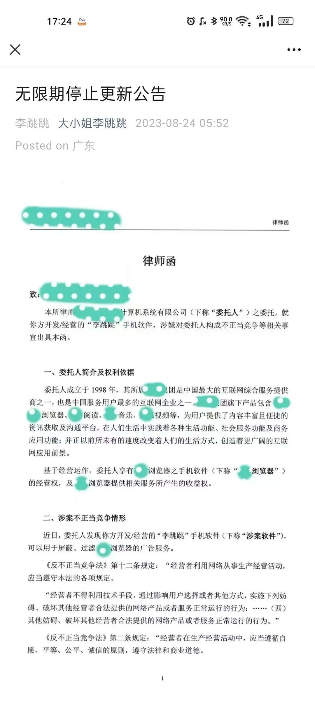 前段时间,因为一封来自南山必胜客律师函,知名开屏去广告软件李跳跳宣布无限期停止更新……