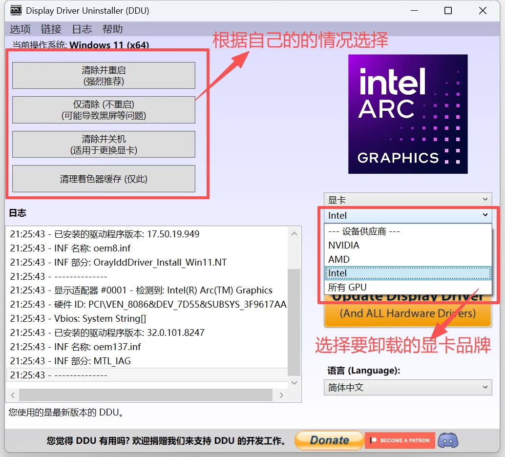 进入卸载界面,右边方框选择你的显卡品牌,然后左边再根据自动的实际情况去选择。(如果不是更换显卡都是选择清除并重启)