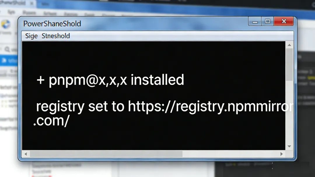 (场景:PowerShell 窗口显示「+ pnpm@x.x.x installed」和「registry set to https://registry.npmmirror.com/」,无红色报错)