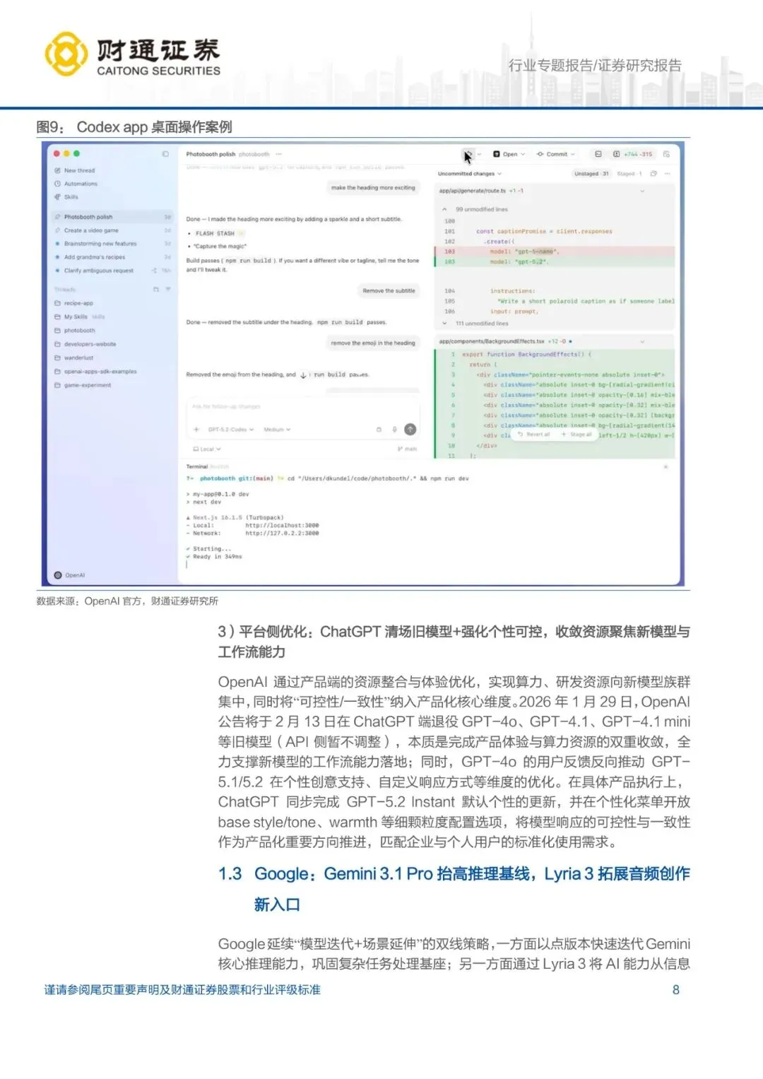 2. OpenAI:GPT-5.3-Codex执行速度较上一代提升25%,Spark版在Cerebras硬件上实现>1000 tokens/s;macOS端Codex app支持100步以上长任务并行,桌面操作案例显示单项目可调用8个Agent同时运行。