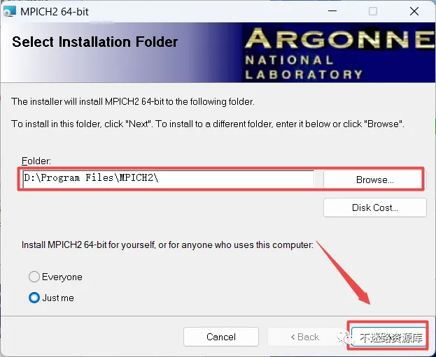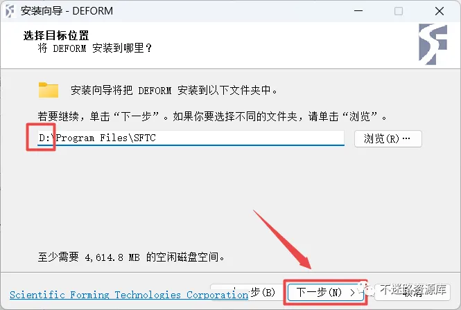 53.点击“浏览“可以选择软件安装路径,建议和教程中的保持一致,本例安装到D盘(将路径地址中的首字符C改为D表示安装到D盘,或者可以在其它磁盘里创建一个新的文件夹,安装路径不要出现中文),点击“下一步”