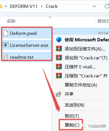 60.返回之前解压的“DEFORM V11”文件夹,双击打开”Crack“文件夹,选中该文件夹下的全部文件,鼠标右键点击“复制”