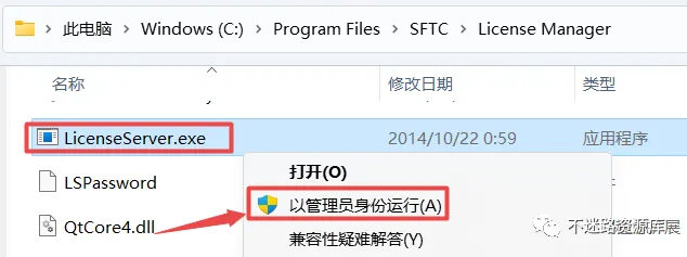 63.找到复制过来的”LicenseServer.exe”文件,鼠标右键选择“以管理员身份运行”