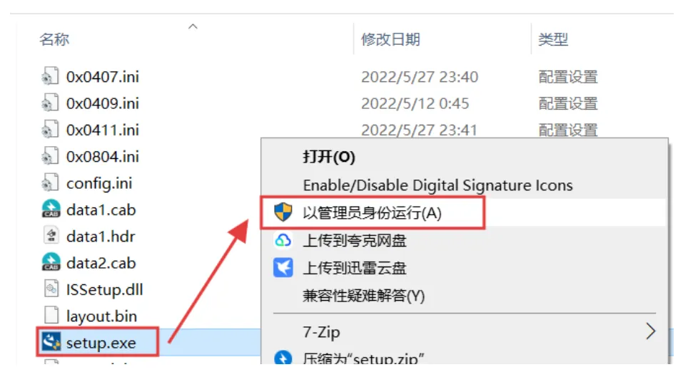 选中setup程序,鼠标右键选择以管理员身份运行。