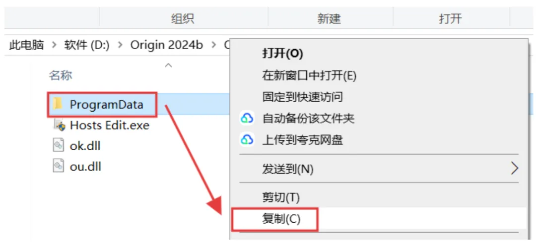 继续回到Crack文件夹内,选中ProgramData文件夹,鼠标右键点击复制。