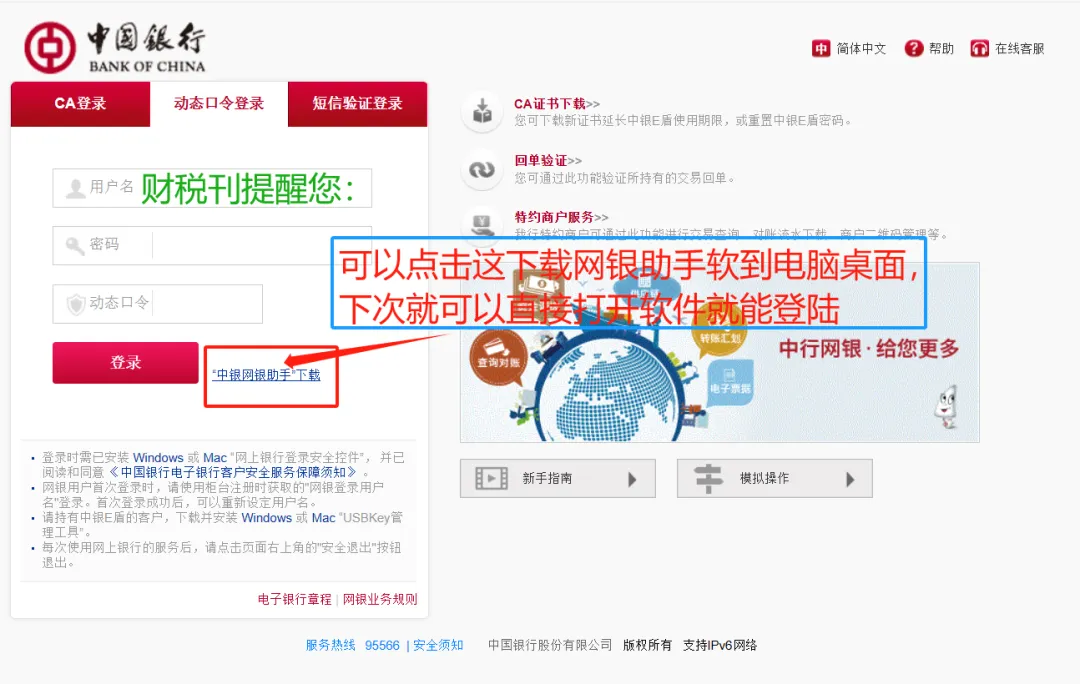 3、第一次登录需要下载“中银网银助手”。已下载过的略过这一步。