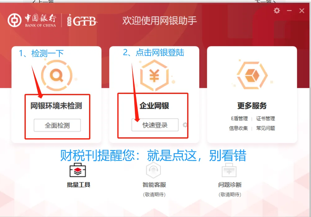 5、先点击检测,检测有问题点击修复,没问题显示正常,可以点击企业网银快速登录。