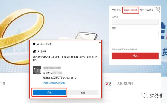 6、点数字证书登录,会弹出证书,如果没有证书弹出,说明系统检测不到网银,拔掉关掉页面重新试过一遍,没问题点击确认。