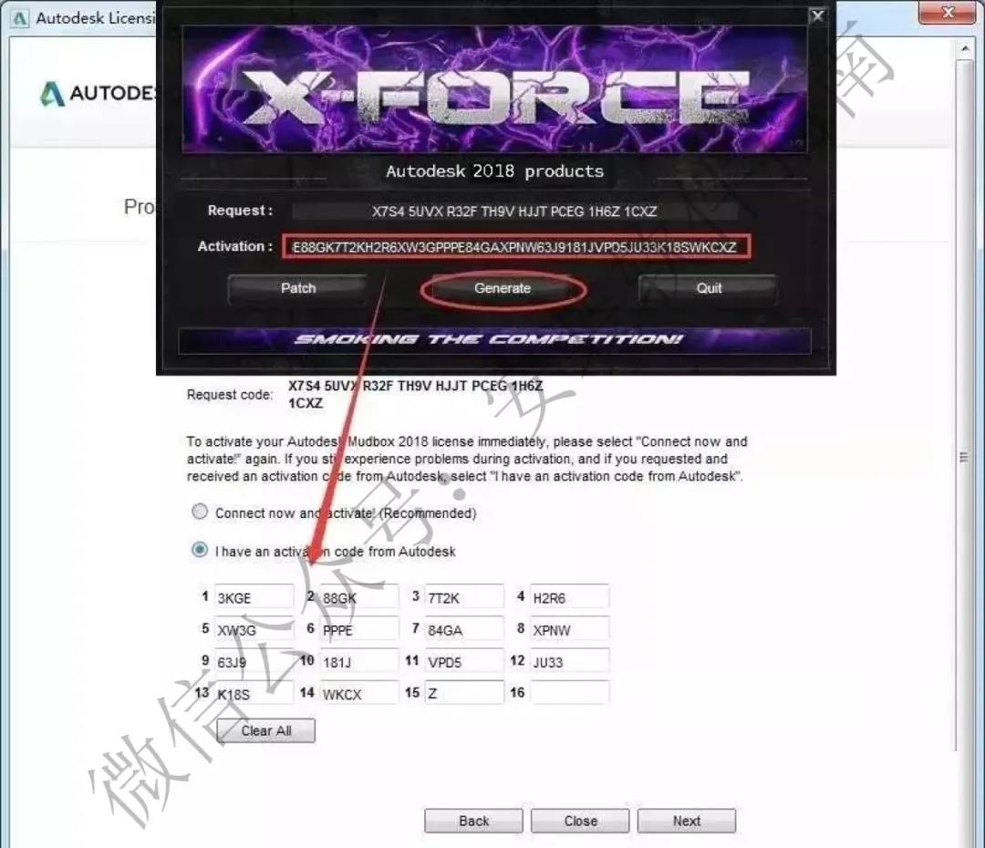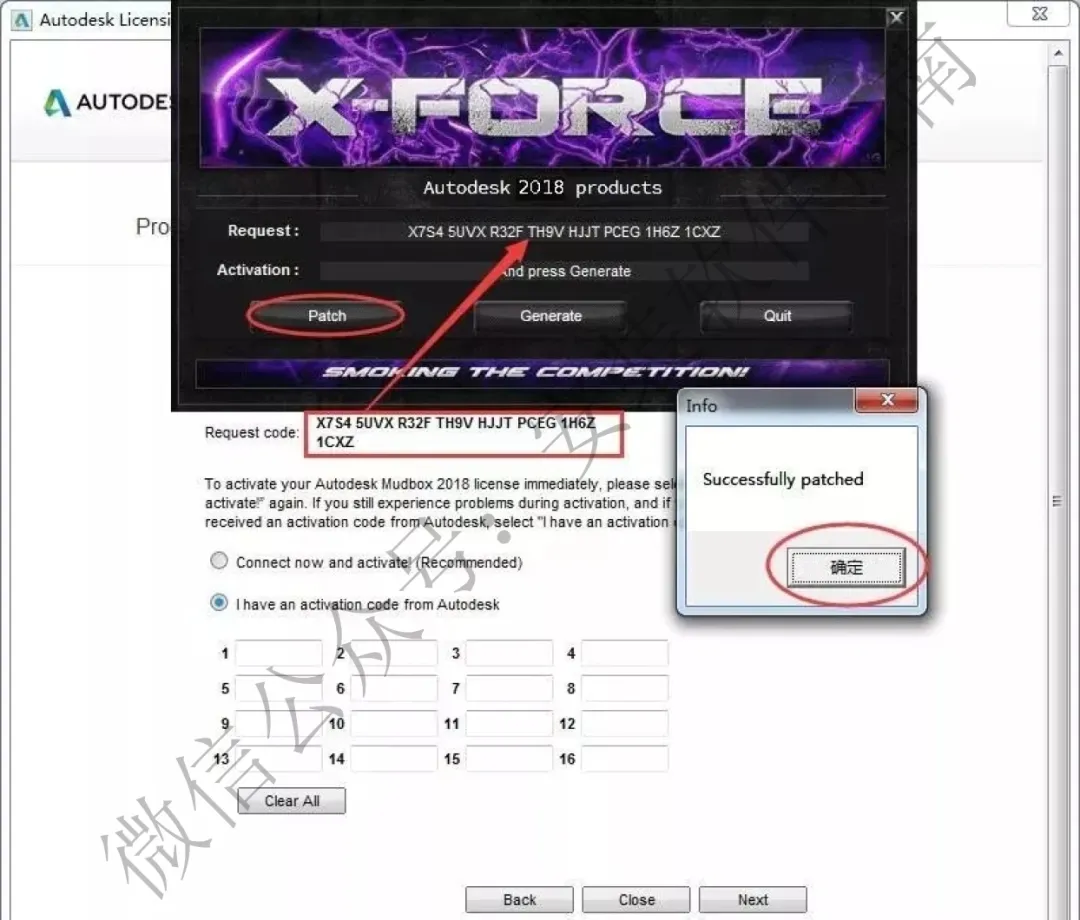 16.将Request code申请码复制到注册机请求码框内,生成激活码,点补丁确定