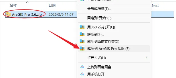 1.鼠标右击下载的【ArcGIS Pro 3.6】压缩包,选择解压到【ArcGIS Pro 3.6】。