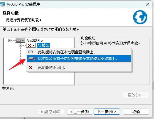 12.右键所有带【红色X】的模块,再点击【此功能及所有子功能将安装在本地硬盘驱动器上】。