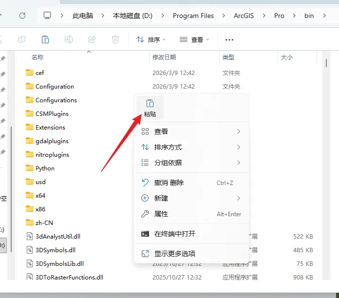 29.打开路径:D:\Program Files\ArcGIS\Pro\bin,再右键文件夹的空白处,点击【粘贴按钮】!