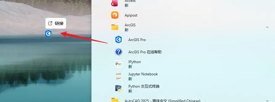 31.回到桌面,点击任务栏的【开始菜单】,在【所有应用】中找到【ArcGIS Pro软件图标】,将软件图标拖到桌面上,完成软件桌面快捷方式的创建。