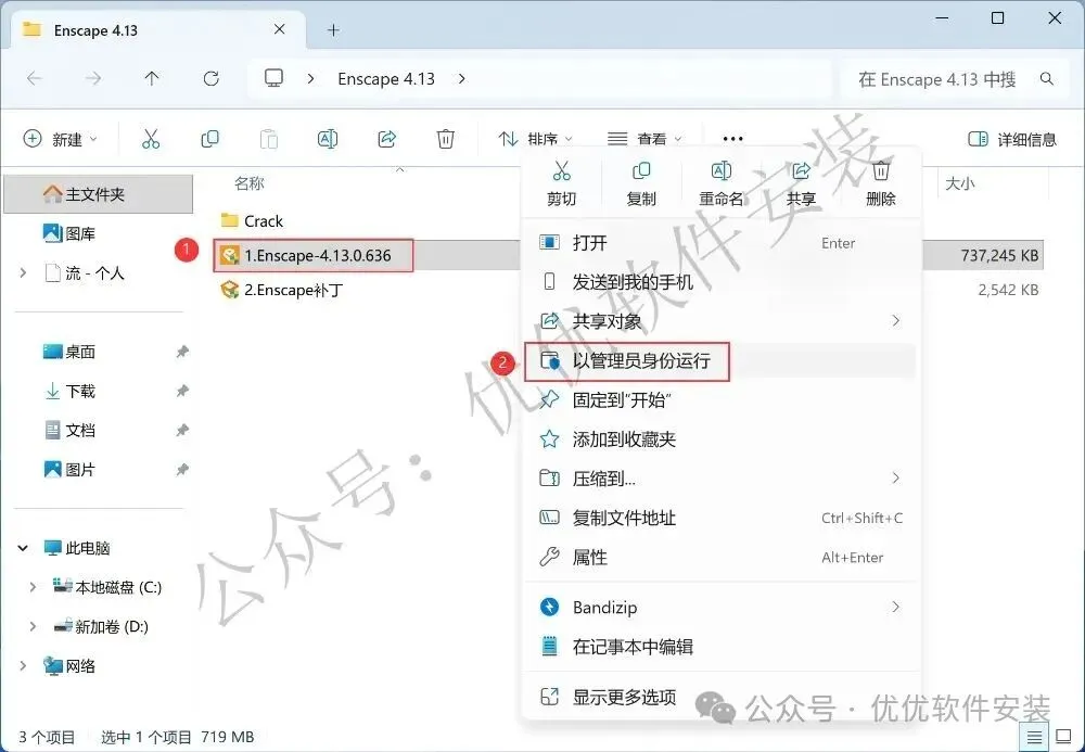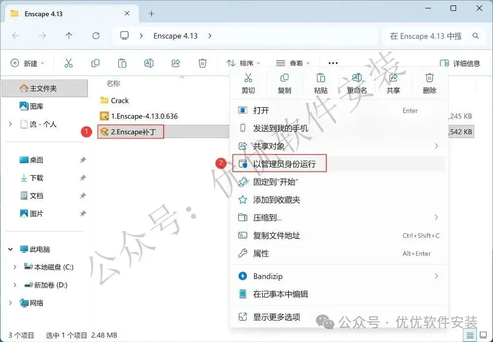 9、回到Enscape 4.13文件夹,找到【Enscape补丁】应用程序,右键选择【以管理员身份运行】它