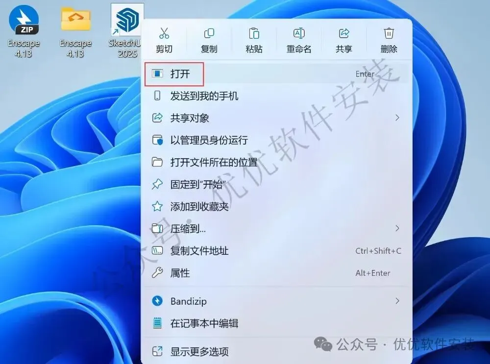 12、回到桌面,右键桌面上的【SketchUp 2025软件图标】,点击【打开】