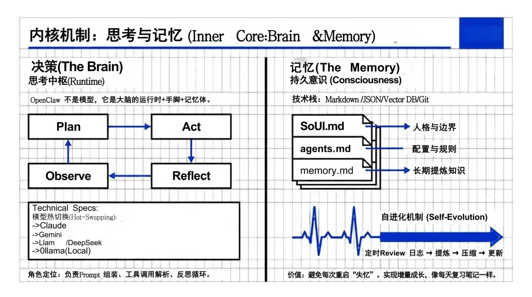 记忆(Memory):基于 Markdown/JSON/Vector DB/Git 技术栈,存储人格配置(soul.md)、代理规则(agents.md)、长期知识(memory.md);